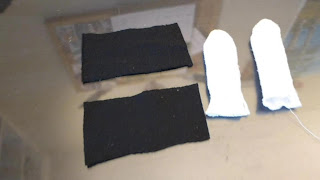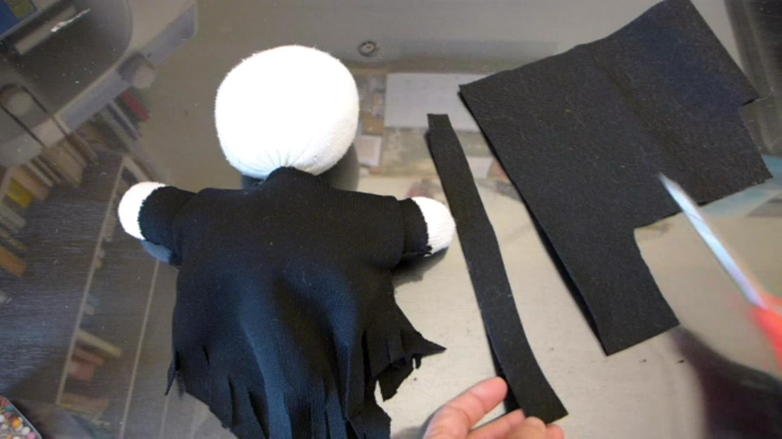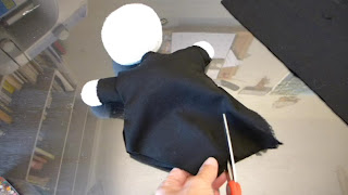 Cut a piece of black fabric so that it will be wider than the doll and hang lower than the body of the doll when it is folded in half. This will make his clothes.