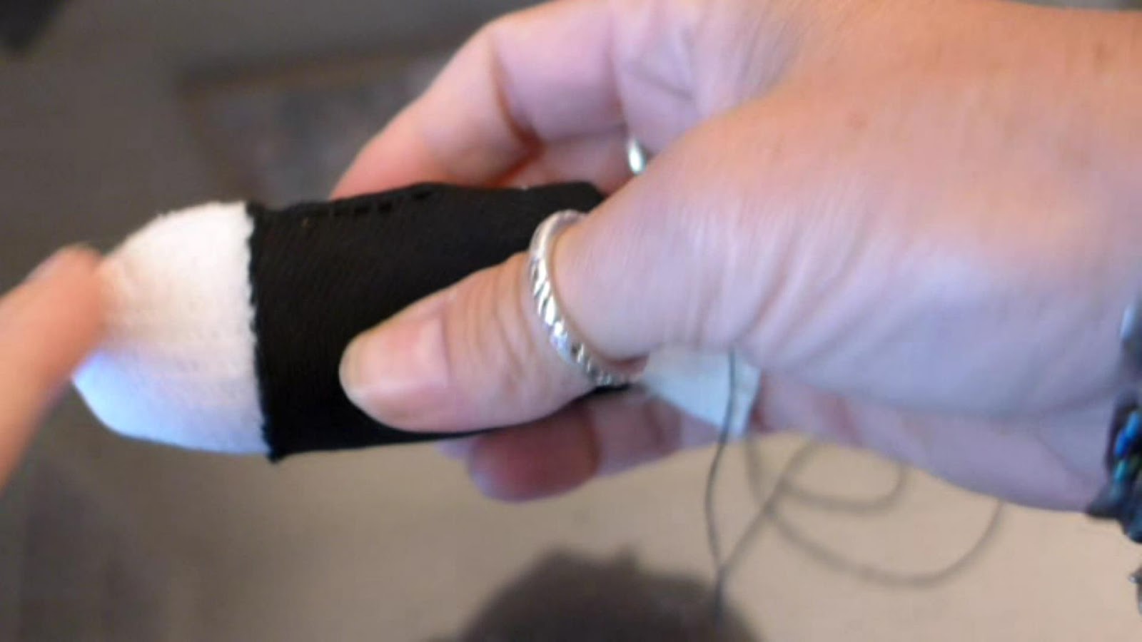 Lets make the arms. I used another sock to make the arms. I had a long sock and cut the top off of the sock and then cut it in half so that it made two pieces.