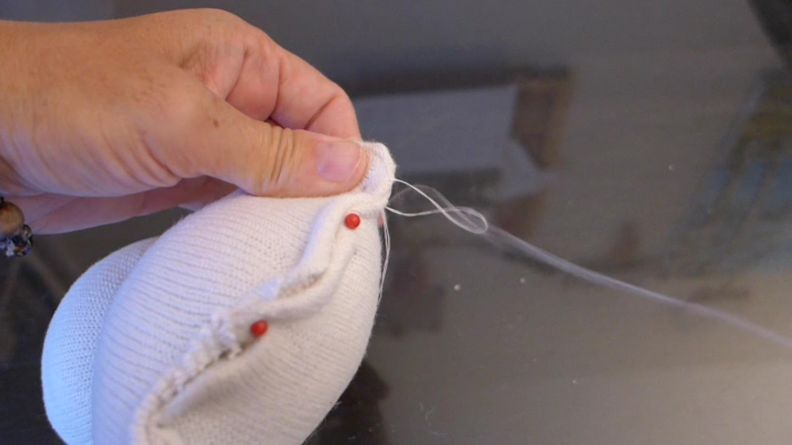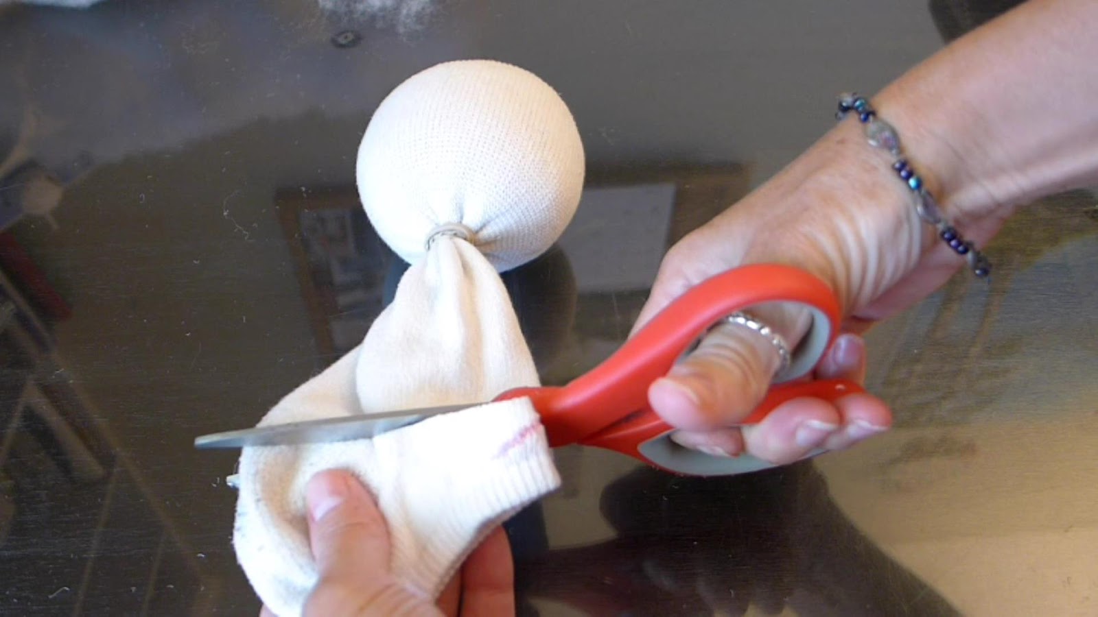 Stuff the toe of the sock with Poly-Fil until the head is the size that you want it. Wrap the rubber band at the base of the head to make the neck. Then cut the heel off of the sock, straight across the bottom like this.